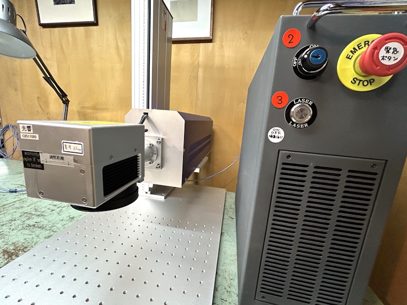 木材の刻印に適した CO₂レーザーマーカー を使用し木の種類や仕上がりの状態を見ながら一点ずつ刻印を行っています